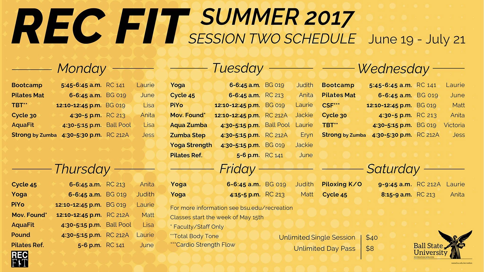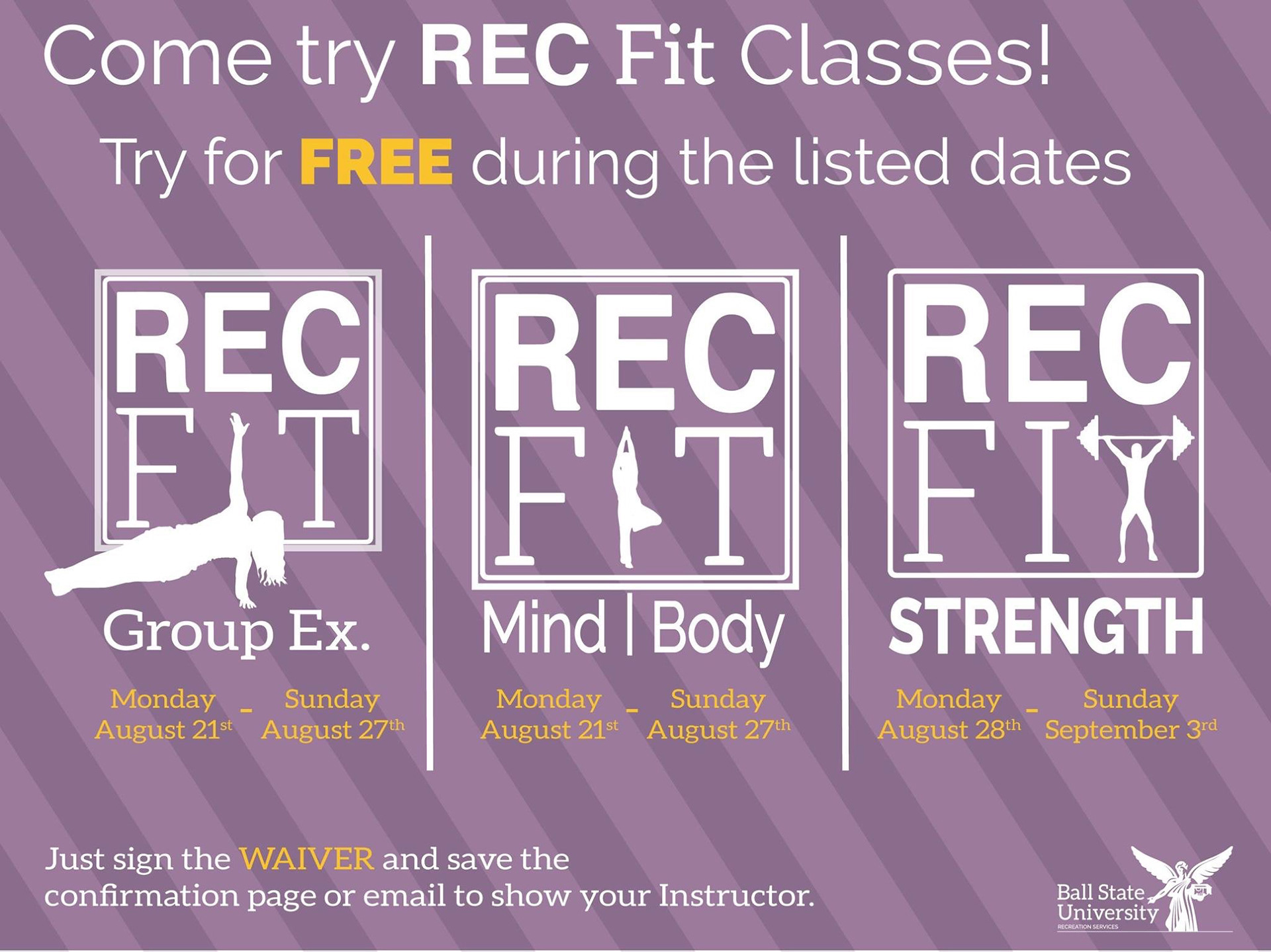 While at school I was employed with the Ball State Recreation Services for 2.5 years as a Marketing/Graphic Designer. During my time there I designed print and digital material advertising for one of the largest student resources the university has to offer. I was trusted by Ball State University to uphold and execute their branding guidelines. I designed material for different events, schedules, programs and announcements. I have produced a large number of monitor slides and social media posts, both motion and static. I also created multiple print jobs from large scale posters to small print sheets, and multiple shirt designs.
